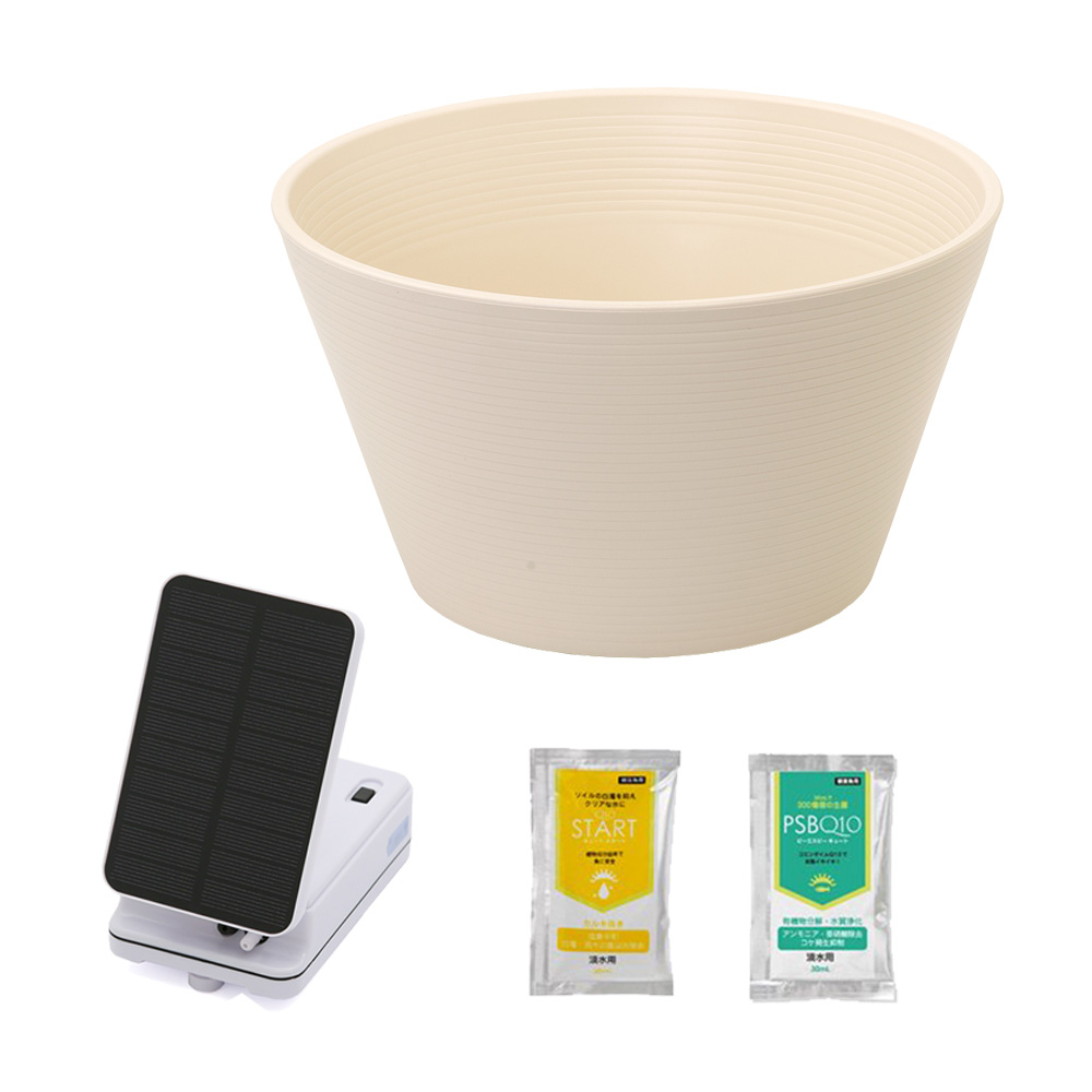 | セット内容 | 睡蓮鉢 ホワイト×1 ソーラー充電式エアポンプ(エアストーン、エアチューブ付属)×1 Q10スタート 淡水用 30mL×1 PSBQ10 ピーエスビーキュート 淡水用 30mL×1 |