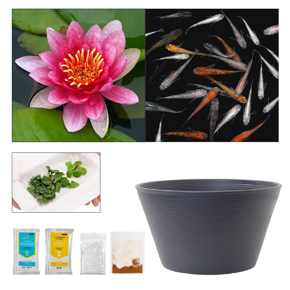 | 特長 | ●これ一つでスイレン育成を始められるスターティングフルセットです。 ●赤系色の温帯性スイレンはチャームが丈夫な商品を選びお届けいたします。 ●上見でも綺麗なラメメダカと、水辺植物の寄せ植えもセットにしました。 ●付属のビオトープの水を入れるだけで水質安定の効果が期待できます。 |