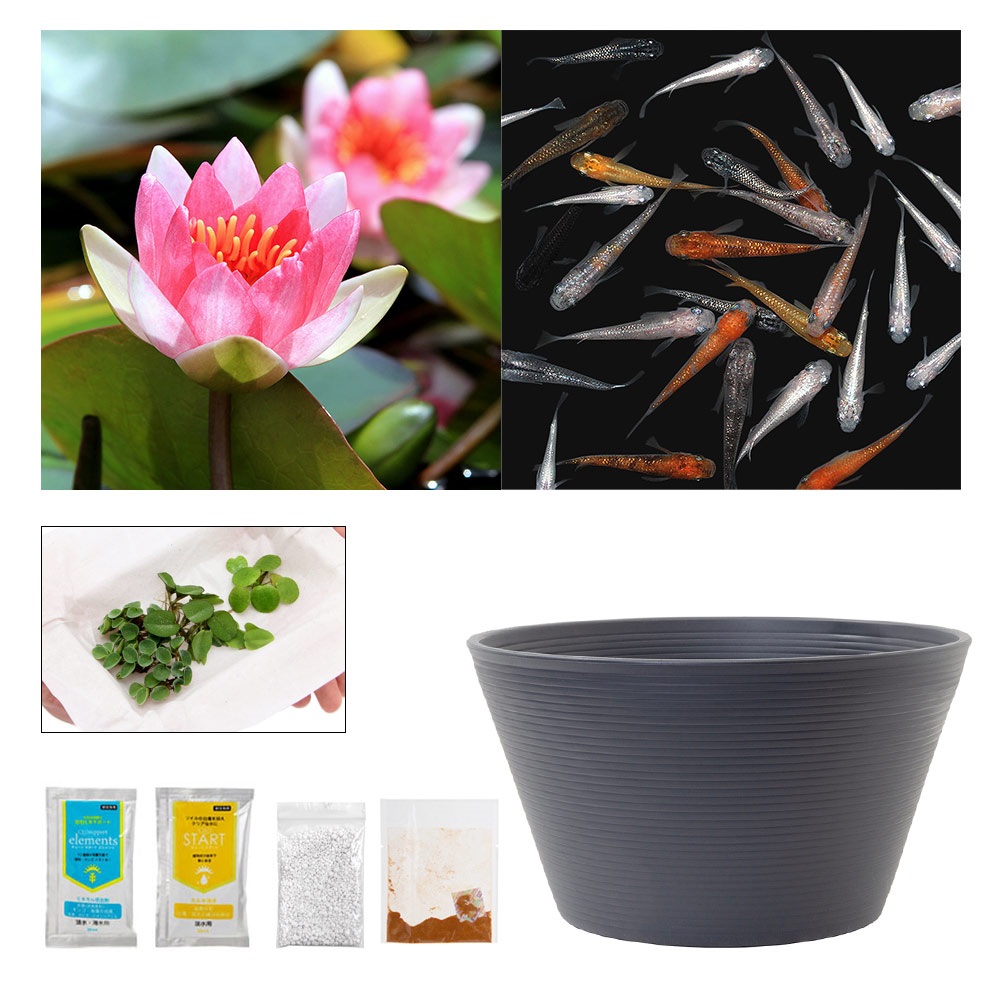 | 特長 | ●これ一つでスイレン育成を始められるスターティングフルセットです。 ●温帯性スイレンはチャームが丈夫な株を選びお届けいたします。 ●上見でも綺麗なラメメダカと、水辺植物の寄せ植えもセットにしました。 ●付属のビオトープの水を入れるだけで水質安定の効果が期待できます。 |