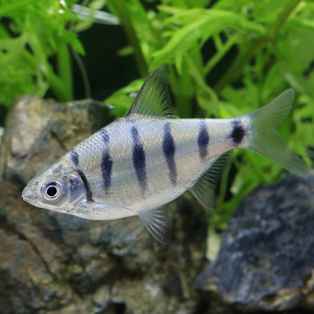 種類詳細 | 南インド原産の大型のコイの仲間です。紺色の縞模様とカラシンを彷彿とさせる細かな鱗が特徴的です。最大サイズは50cmとされますが幼魚以上の情報が少なく、飼育下でどこまで成長するかは不明です。飼育は容易ですが活発に泳ぎまわる為、広めの水槽での飼育が好ましいでしょう。 |