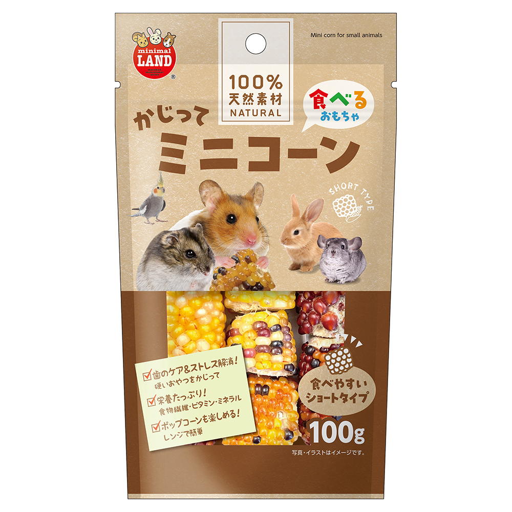 | 特長 | ●小さなペットにも与えやすい、食べるおもちゃです。 ●歯のケア&ストレス解消におすすめです。 ●食物繊維・ビタミン・ミネラルたっぷり。 ●ほぐしたコーンを耐熱容器に入れてラップをかけて、500Wで2〜4分程度加熱するとポップコーンも楽しめます。 |