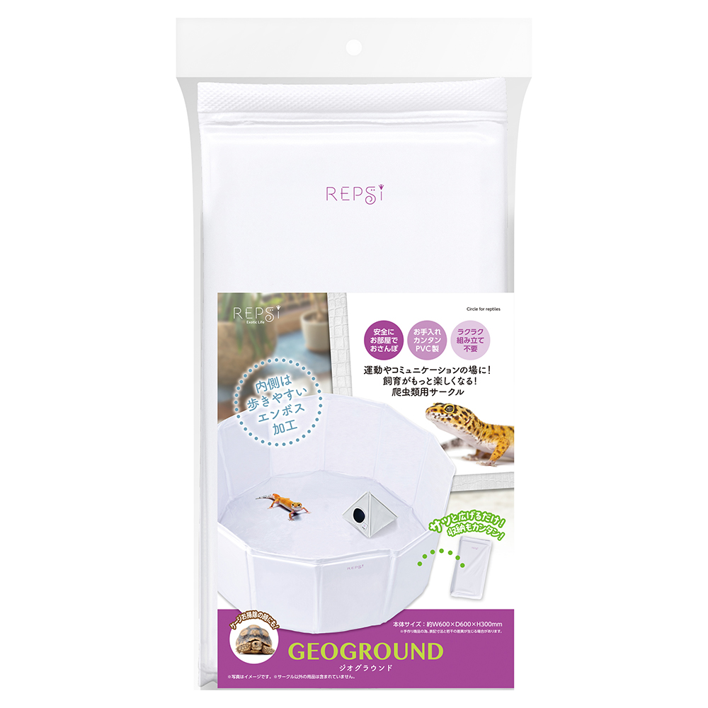| 特長 | ●運動やコミュニケーションの場に使える、飼育がもっと楽しくなる爬虫類用サークルです。 ●内側は歩きやすく、すべりにくいエンボス加工を施しています。 ●汚れがつきにくく、ふき取りやすいPVC素材を使用しています。 ●使わないときは簡単にたたんで収納可能です。 |