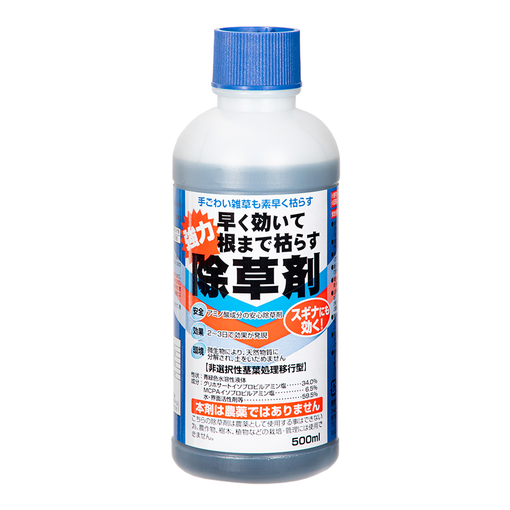 | 特長 | ●アミノ酸系除草剤なので、散布後の土壌に成分が残留せず、環境にやさしい安心・安全な除草剤です。 ●グリホサートにMCPAを配合した速効性の高い除草剤です。 ●微生物により、天然物質に分解され土をいためません。 ●本剤は農薬ではありません。こちらの除草剤は農薬として使用する事はできない為、農作物・樹木・植物などの栽培・管理には使用できません。 |