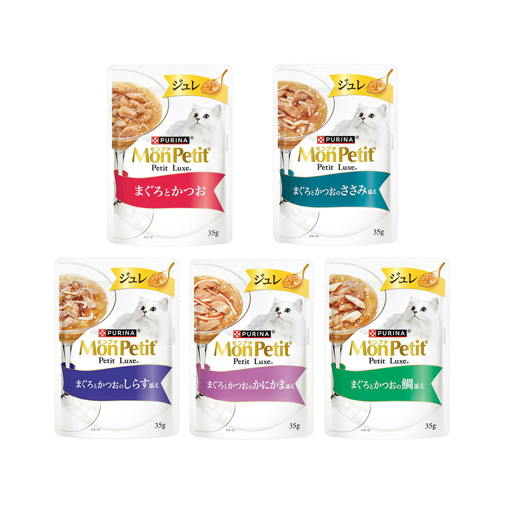 | 特長 | ●厳選された素材を使用したプチリュクスジュレシリーズの5種類をアソートセットにしました。 ●ジュレの滑らかな質感が猫の食欲を刺激します。 |