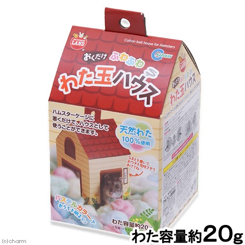 | 特長 | ●ハムスターケージに置くだけで、ハウスとして使うことができます。 ●ペットに優しい天然わたを100%使用しています。 ●玉状のわたなので、ハムスターが取り出しやすく、散らばりにくい仕様です。 |