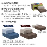 | 特長 | ●段差の上り下りをサポートするステップです。 ●ゆるやかな傾斜で足が短い犬猫・小さい犬猫やシニアにもやさしいです。 ●広げてマットとして、折りたたんで2段に、2台を組合せて3段ステップにしても使えます。 ●底面にはスベリ止めがついています。 |