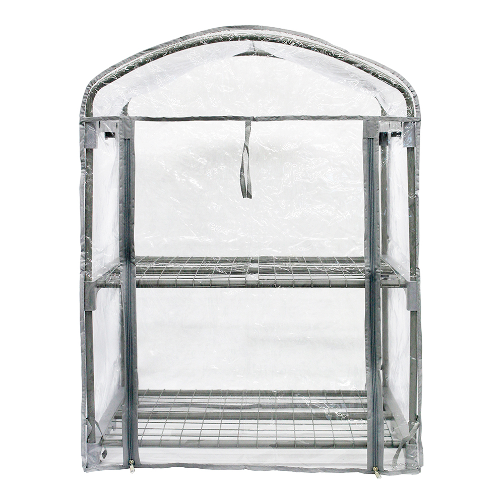 | 特長 | ●温度が下がる朝夕時、寒い季節、霜や雪からかわいい植物を守ってくれる簡易ビニールハウスです。 ●ビニールカバーを外すと年間を通してフラワースタンドとしてもご利用できます。 ●軽いので設置、移動がラクラク行えます。 ●パイプを差し込むだけなので、工具を使わずに組み立て可能です。 ●前面はジッパーで大きく開くので、植物の出し入れが簡単。開いたカバーは上部で固定できます。 ●棚網の各段は2つに分かれて取り外しができるので、背の高い鉢ものせられ、背の高い植物と低い植物を組み合わせて温室内に飾ることができます。 |