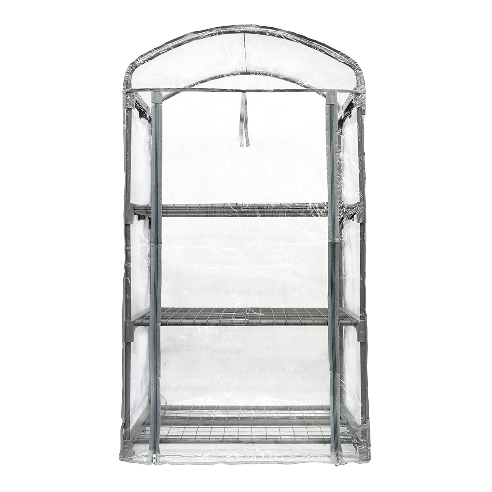 | 特長 | ●温度が下がる朝夕時、寒い季節、霜や雪からかわいい植物を守ってくれる簡易ビニールハウスです。 ●ビニールカバーを外すと年間を通してフラワースタンドとしてもご利用できます。 ●軽いので設置、移動がラクラク行えます。 ●パイプを差し込むだけなので、工具を使わずに組み立て可能です。 ●前面はジッパーで大きく開くので、植物の出し入れが簡単。開いたカバーは上部で固定できます。 ●棚網の各段は2つに分かれて取り外しができるので、背の高い鉢ものせられ、背の高い植物と低い植物を組み合わせて温室内に飾ることができます。 |