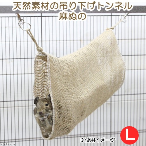 | 特長 | ●麻ぬのを使用した手作りの小動物用吊り下げトンネルです。 ●ケージ天井面に吊るして設置します。 ●着色料や保存料は使用しておりません。 ●小動物の足場や休憩場所にご使用下さい。 |