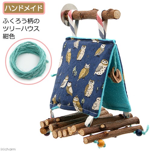 | ふくろう柄のツリーハウス 【紺色】 ハンドメイド 小鳥 交換用麻紐付き | |