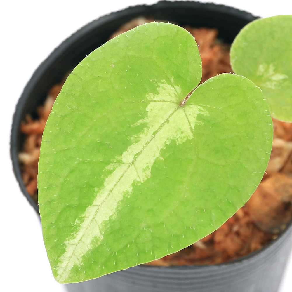 | 特徴 | オナガサイシンは南西諸島、台湾、中国南部に見られるフタバアオイの仲間です。 光沢のある広心形の葉と茎に長い毛が生え、本タイプは葉の中心に斑が入ります。 育成は春先の芽出しの頃はしっかり日に当てますが、後は通年半日陰で管理します。 水切れ、加湿の両方に弱く鹿沼土単用などにして水はけの良い用土を使用し高植えにしたほうが良いでしょう。 耐寒性の強い種ですが、冬季は凍結に注意が必要です。 花は株の根元につく場合が多いため観賞しやすくするためには、鉢の高さや植え付け高さに工夫が必要です。 |