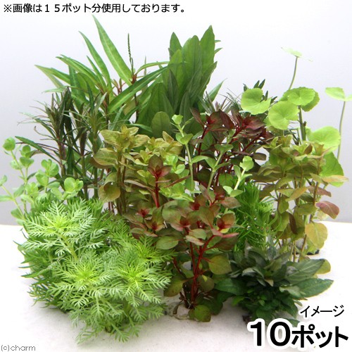 | 注意 | 掲載写真は15ポット分を用いたセットイメージです。季節によりサイズや葉数、色、量等が画像と異なる場合がございます。 ポット、水草は低床に植え込み栽培して下さい。浮力がある為そのままでは浮き上がってしまう場合があります。 植物の種類はおまかせとなっております。形状や色彩は選べません。 枯れや葉の痛みなどが入る場合がございます。ご了承の上お買い求めください。 |
