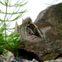 | 繁殖 | 幼魚ではオスメスの判別は困難なため数匹で飼育し、その中から十分に成熟したペアを得られれば、春から夏にかけて産卵します。 オスは繁殖期になると非常にテリトリー意識が強くなるので十分な隠れ家を用意すると良いでしょう。 繁殖はペアで行われ、パイプや水草の茎、流木などの直立した基質に産卵します。 産卵後は孵化までオスが世話をしますが、メスが追い回されることが多いので別の水槽へ隔離すると良いでしょう。 孵化後はオス個体も別水槽に移したほうがよいでしょう。稚魚は孵化したてのブラインシュリンプを口にすることができます。 |