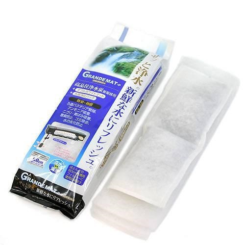 | 特長 | ●高品位活性炭を採用した吸着能力に優れた機能性マットです。 ●活性炭はウールバッグに入っており、このバッグ自体がバクテリア繁殖など、ろ過能力を発揮します。 ●グランデ600/600Rの交換用マットとしてオススメです。 ●もちろん、ほとんどの60cm水槽用フィルターにも使用できます。 ●飼育水60L以下の水槽に、淡水、海水を問わずご使用いただけます。 |