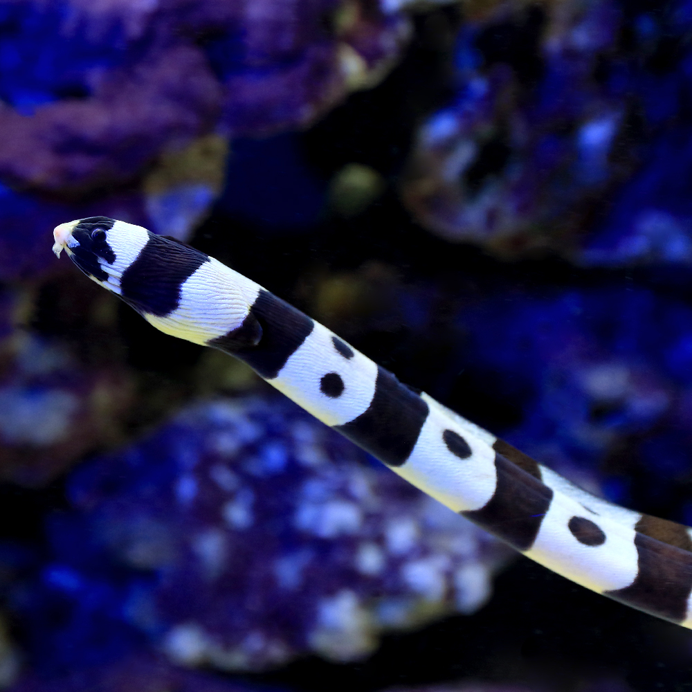 | 種類詳細 | インド洋から太平洋にかけて広く生息するゴイシウミヘビ属の一種で、黒と白の縞模様が目を惹く種類です。 当個体は縞模様の間にスポットが入る希少な個体です。 ウミヘビと名前が付いていますが、爬虫類のウミヘビと違い毒を持たず、ウナギに近い種類となります。 独特の模様は毒を持つエラブウミヘビ等に擬態している物と言われています。 |