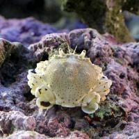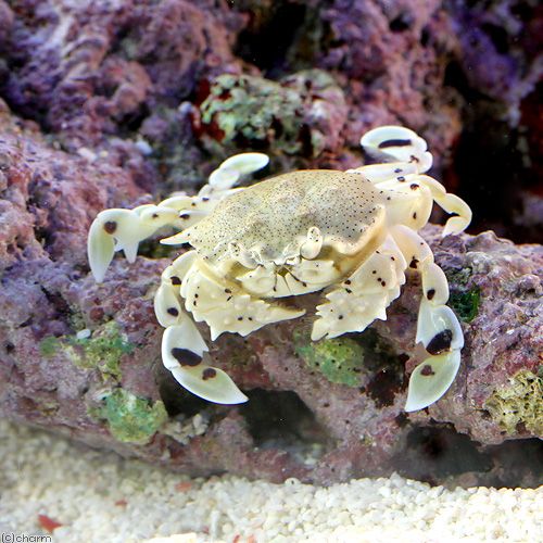 | 飼育のポイント | 丈夫な種類で、飼育方法も一般的なカニの飼育方法と同様で問題ありません。 エサは人工飼料などを与えましょう。 夜間に寝ている魚などを襲う可能性があるので、混泳には注意が必要です。 細かいサンゴ砂を敷くと砂の中に潜る様子を観察することが可能です。 |