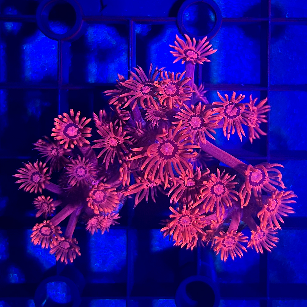 | 飼育のポイント | 水質は常に硝酸塩やリン酸塩など栄養塩類が極めて低い環境が適しています。 水流は強すぎると弱ってしまうので、触手が緩やかにたなびく程度にサンゴ全体にあたるような太い水流が適しています。 照明は強めのものが向いていますが、赤や緑の強いタイプはブルー系のランプを多めに照射すると色が浮き立ち美しい姿になります。 微量元素の不足に弱い面があるため、カルシウムリアクターやアラゴナイト系の底床材、または添加剤の使用が有効です。 刺胞毒が強く、近くに他種のサンゴがあると毒に弱い種類は弱ってしまうので接触しないよう注意が必要です。 |