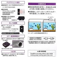 | ご注意 | ※本品は、屋内観賞魚飼育専用です。他の目的や屋外では使用しないでください。 ※吐出量はエアーストーンの種類、エアーチューブの長さや接続方法、水深などにより異なります。 |