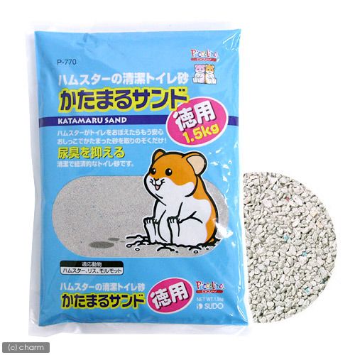 | 特長 | ●本品は、清潔で経済的なトイレ砂です。 ●ハムスターはオシッコのにおいでトイレを覚えます。覚えたらもう安心です。あとは、おしっこで固まった砂を取り除くだけです。 ●かたまるサンドは、自然界に産するベントナイトという特殊な粘土鉱物が主成分となっています。 ●水分を吸収すると固まるその性質は、ハムスターのトイレとして最適です。 |
