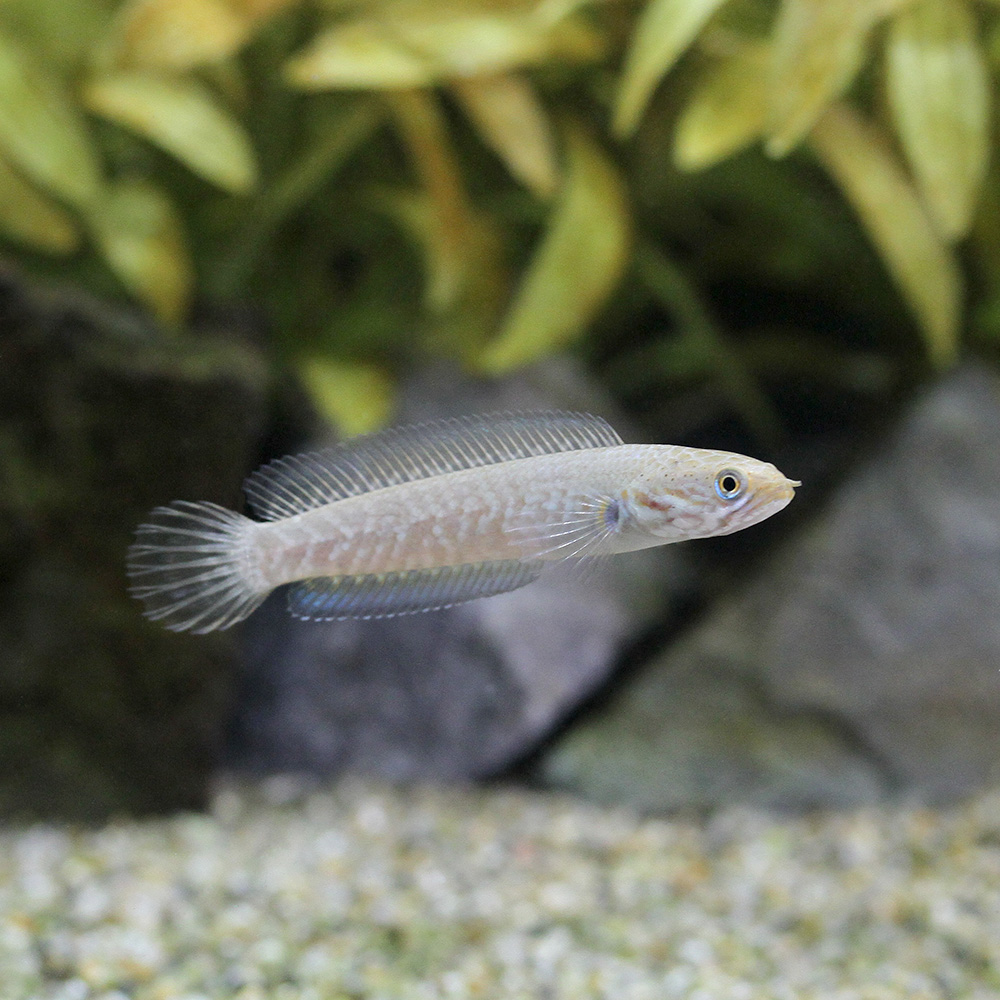 | 種類詳細 | インド原産の比較的新しいスネークヘッドの仲間です。 レインボースネークヘッドと良く似た外見を持つ種ですが、背ビレと尻ビレがブルーに発色する特徴を持ちます。 飼育は弱酸性〜中性を保てれば容易で、餌も人工飼料に餌付かせやすく飼育は容易です。 飼育者にも懐きやすく魅力的な種ですが、僅かな隙間からでも水槽から飛び出すので、しっかりとフタを用意する必要があります。 |