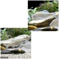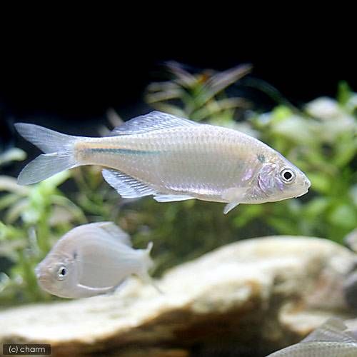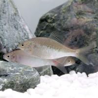 | 繁殖 | タナゴの仲間は2枚貝に産卵する特殊な産卵形態を持ちます。産卵期を迎えたオスは美しい色彩を発揮し、メスは輸卵管がぶら下げて泳ぎます。産卵に適した2枚貝を水槽に入れると、発情したオスがその貝の上でテリトリーを主張し、気に入った貝にメスを誘導し産卵行動を行います。この際、オスは非常に気が荒いので他のオスが追い回されないように十分な隠れ家を用意すると良いでしょう。卵は貝の中で孵化し、1ヶ月程で稚魚が浮上してくるので、水槽内に産卵用の2枚貝を投入後3週間ほどで別水槽に移動すると良いでしょう。 2枚貝を水槽に投入する際は砂に潜って回収できなくならないよう、浅いプラケースなどに細かい砂を薄く敷いてそのまま水槽内に沈めると良いでしょう。産卵が終わった貝を移動する際は水質の変化に十分に気をつけ、2枚貝にダメージを与えないよう注意が必要です。また、貝が閉じるときに卵が吐き出されないように慎重に取り扱ってください。稚魚が浮上するまでの1ヶ月の間、長期飼育が難しい2枚貝をうまく維持できるかがポイントです。 2枚貝から浮出した稚魚はすぐにブラインシュリンプを食べることができます。稚魚用の人工飼料も食べ、10日程でイトメも食べられるようになります。 |