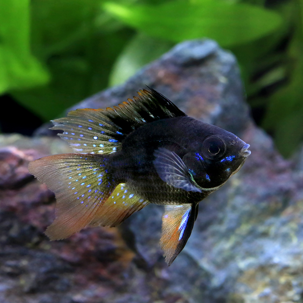| 種類詳細 | バルーンダークナイトラミレジィのロングフィン個体です。 体色が真っ黒くなるように改良された品種でその色彩と各ヒレのオレンジ〜赤い発色がとても美しい種です。 飼育、繁殖ともに容易な種ですが、十分に成熟しないとオスメスの判別は難しいです。 極端にサイズが小さくなければ小型のカラシン等との混泳も可能です。 |