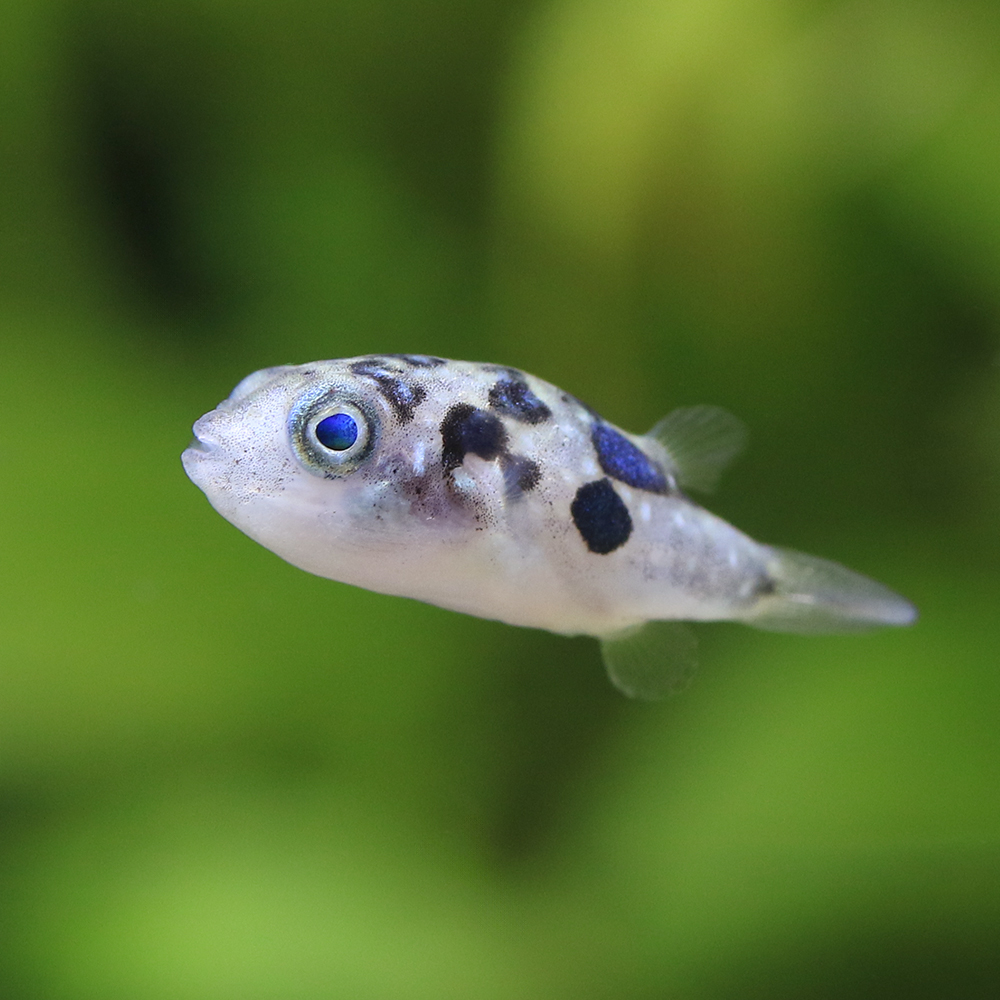 | 種類詳細 | インド、スリランカ原産の淡水フグの仲間です。フグの仲間で世界最小の種で、愛くるしいその姿から近年のフグ人気を押し上げた種と言えます。フグの仲間では珍しく純淡水で飼育可能で、小型の貝類を食べてくれるため水草水槽でも重宝します。また水槽内での繁殖例も知られます。アカメフグの仲間と同じように威嚇時には腹部と背部の皮を伸ばして少しでも体を大きく見せようとします。飼育はスレに弱い為、導入時に注意が必要です。また、ケンカなどで痩せすぎた個体は調子を戻すのが難しく、混泳やエサについても注意が必要です。餌は基本的には赤虫やイトメなどの生餌が必要不可欠です。人工飼料はクリルであれば時間はかかりますが慣れさせることが可能です。フグの仲間では温和な方ですが、フグらしく他の魚に噛み付くことがあるので単独飼育が理想です。混泳させる場合は水草などで隠れ家を作ってあげれば不可能ではありませんが、動きの遅い種やヒレの大きな種は混泳には適しません。また小型のエビなども絶好のエサになる為混泳に適しません。 |