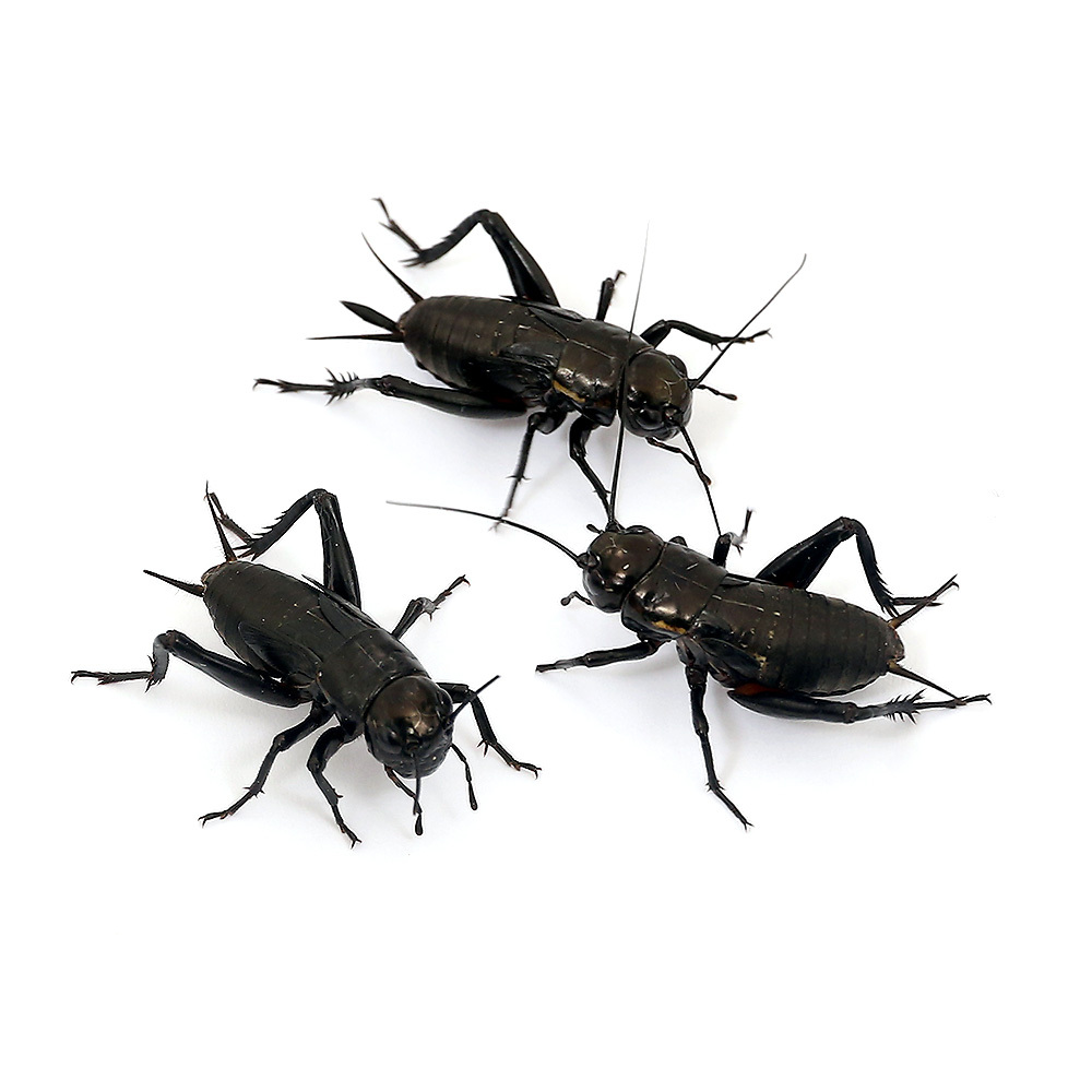 | どんな種類? | クロコオロギはフタホシコオロギを選別交配させることにより作出されたコオロギです。通常のフタホシコオロギに比べ、体が大きく動きが鈍い、羽が生えるまでの期間が長いなどの特徴があります。頭部が大きいため小型の爬虫類・両生類に与えると消化不良を起こす可能性がありますのでご注意ください。飼育は簡単で、プラケースや衣装ケースなどの容器で飼うことができます。水切れに弱く、水を切らすと大量死させてしまうこともあります。逆に、水をこぼしたりして常に湿った状態になるとアンモニアが大量発生し大量死につながる事があります。また、飼育容器が小さい場合・隠れ家が少ない場合には共食いをする恐れがありますのでご注意下さい。 |