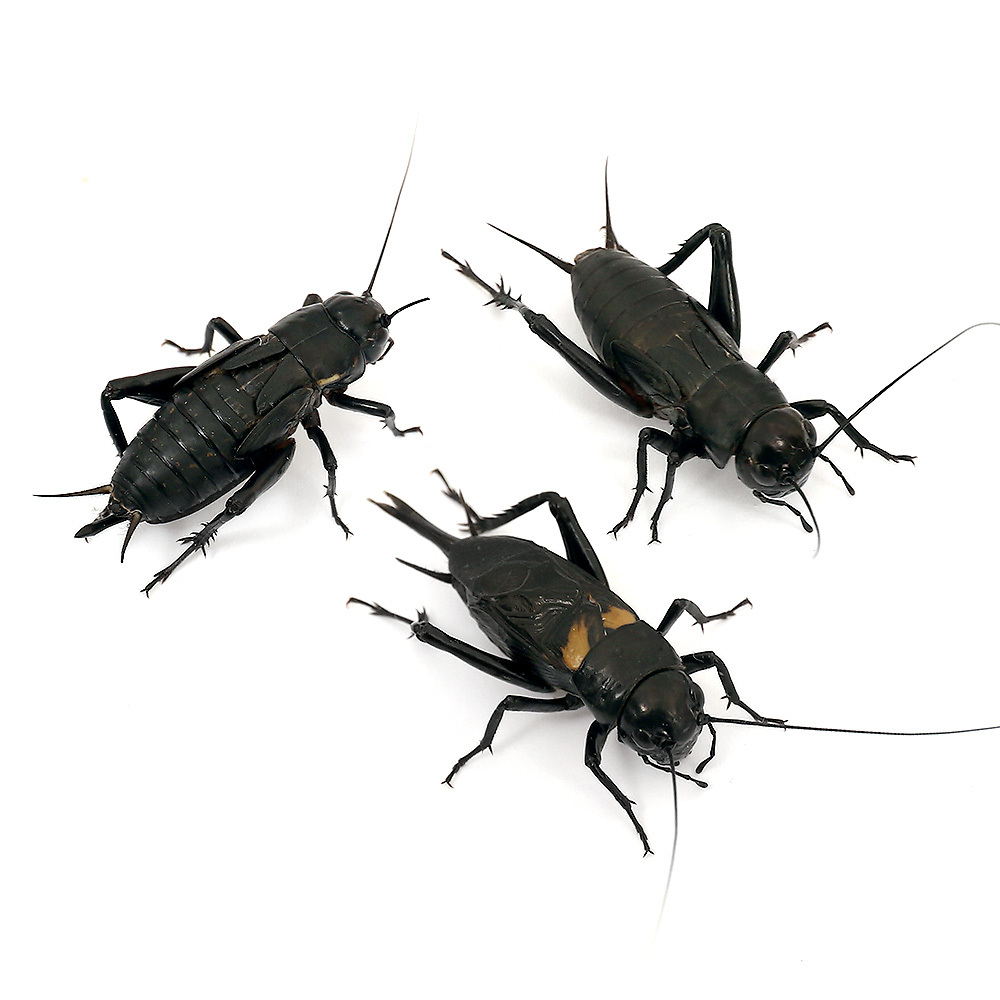 | どんな種類? | クロコオロギはフタホシコオロギを選別交配させることにより作出されたコオロギです。通常のフタホシコオロギに比べ、体が大きく動きが鈍い、羽が生えるまでの期間が長いなどの特徴があります。頭部が大きいため小型の爬虫類・両生類に与えると消化不良を起こす可能性がありますのでご注意ください。飼育は簡単で、プラケースや衣装ケースなどの容器で飼うことができます。水切れに弱く、水を切らすと大量死させてしまうこともあります。逆に、水をこぼしたりして常に湿った状態になるとアンモニアが大量発生し大量死につながる事があります。また、飼育容器が小さい場合・隠れ家が少ない場合には共食いをする恐れがありますのでご注意下さい。 |