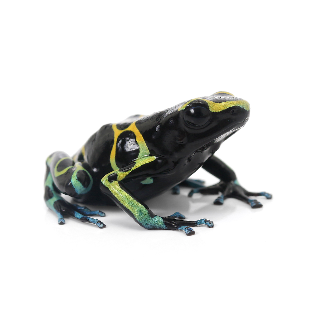 | どんな種類? | ベネズエラを中心に生息するヤドクガエル科(Dendrobatidae)の仲間です。狩りに使用する吹き矢の毒として用いられていたことからヤドクガエルの名前がついています。また、ヤドクガエルの毒は餌として摂取している昆虫から生成されるため、CB個体には毒がないことが知られています。 黒い体に黄色の帯模様が大胆に入る本種は、美しくかつ飼育もしやすいため非常に人気の高い種類です。 脚に青〜緑色をしているのも本種の特徴です。ヤドクガエルの仲間としては4cm程度とやや大型になりますが、性格は穏やかで、個体間での争いもほとんどありません。基本的に地上棲ですが、ケージ内を立体的に作ると活発に動く様子が見られるでしょう。 |