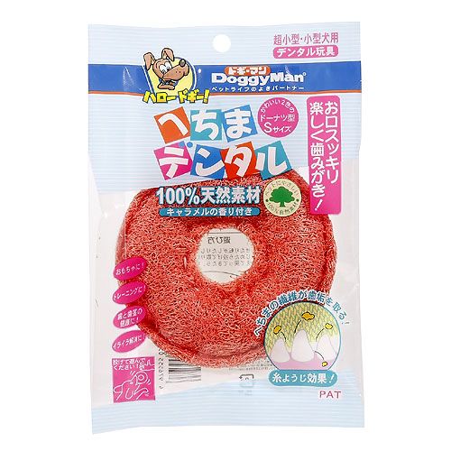 | ドギーマン へちまデンタル ドーナツ型 S | | 特長 | ●しっかりしたへちまの繊維で、歯をブラッシング。歯の汚れをかき出しながら、歯ぐきのマッサージ、ストレス発散などにご利用ください。 ●使用後に洗って乾かせばまた、しっかりしたかたさに戻ります。 ●甘いキャラメルの香りつきで、愛犬も興味津々です。