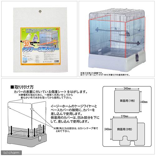 | 特長 | ●3面の透明パネルでイージーホーム37シリーズの周囲(側面・背面)をカバーし、水しぶきや餌クズ・抜けた羽・油粉などの飛び散りからお部屋をガードします。 |