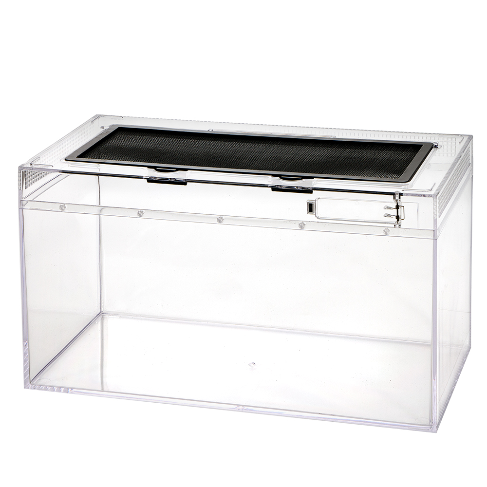 | 特長 | ●爬虫類や両生類の飼育に適したクリアケースです。 ●透明度が高いポリカーボネイトを使用しているので耐久性に優れているだけでなく、鑑賞性も抜群です。 ●フタは3ヶ所でロックがかかっているので生体が逃げ出してしまう心配がありません。 ●フタの左右にコード穴があるので、ケース内にフィルターなどを入れることもできます。 ●フタの左右と後ろ側に通気穴があり、上部はメッシュになっているので通気性も確保されています。 |