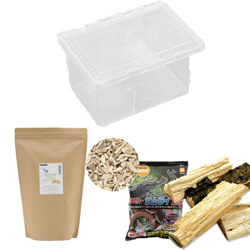 | 特長 | ●無駄がなく、衛生的な管理ができる飼育セットです。 ●一般的な飼育から、非ブリード時の通常管理にオススメです。 ●内部の視認性、外観、保湿性、コバエの侵入しにくさと、メリットの多いケースを採用しました。 ●転倒防止材、吸水性や保水性に優れたケナフチップが快適な環境を提供します。 ●広口かつ浅型で食べやすく、エサ皿付きのゼリーを採用しました。 ●ブリードを趣味とするスタッフにより構成された、プロ仕様の安心セットです。 |