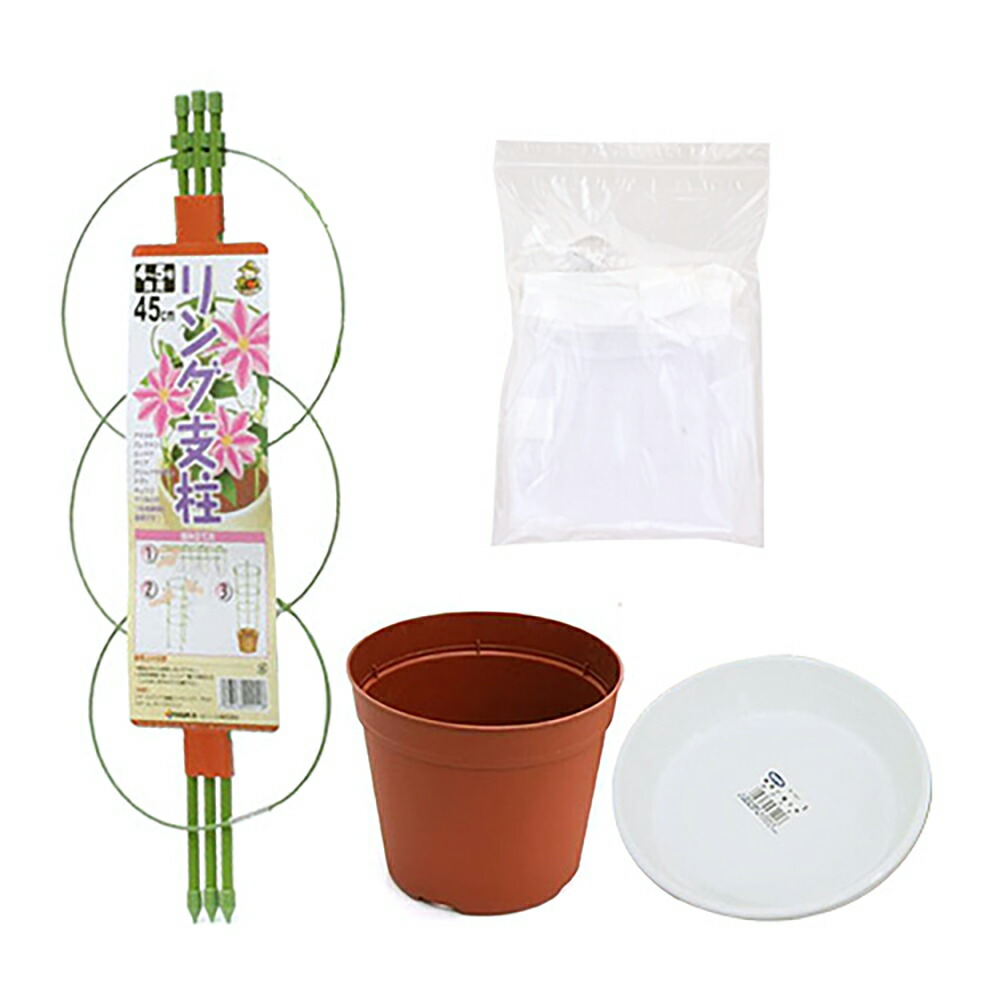 | セット内容 | ・クリアネットケージ用 ネット(色おまかせ)×1 ・ リング支柱 45cm(4〜5号鉢用)×1 ・ 鉢皿 F型 5号(ホワイト)×1 ・プラポット 14.5cm 5号ポット 茶 穴ありタイプ×1 ※本セットは植物・土は付属しません。 |