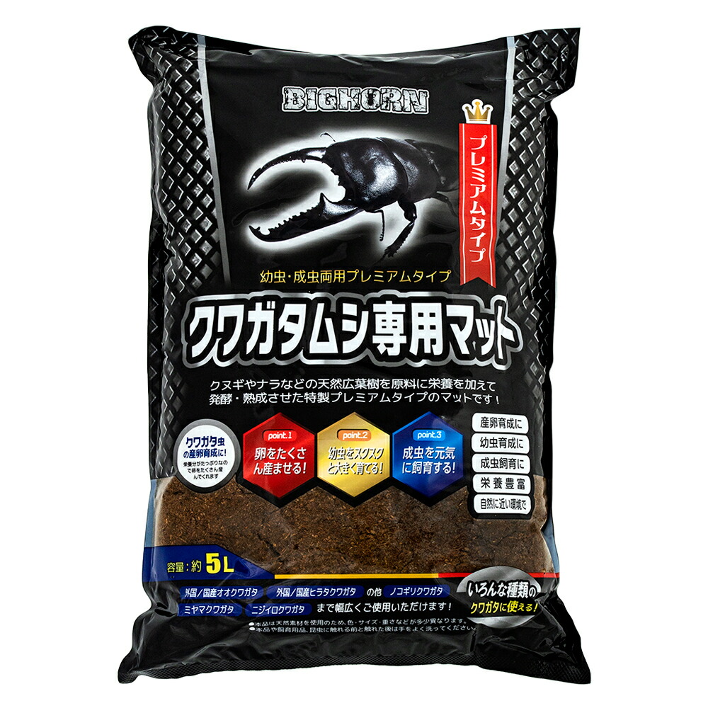 | 特長 | ●天然広葉樹を原料に栄養を加えて、発酵・熟成させたマットです。 ●国産クワガタから外国産クワガタまで幅広くご使用いただけます。 ●成虫管理・産卵セット・幼虫の育成・サナギの管理などの飼育に最適です。 |