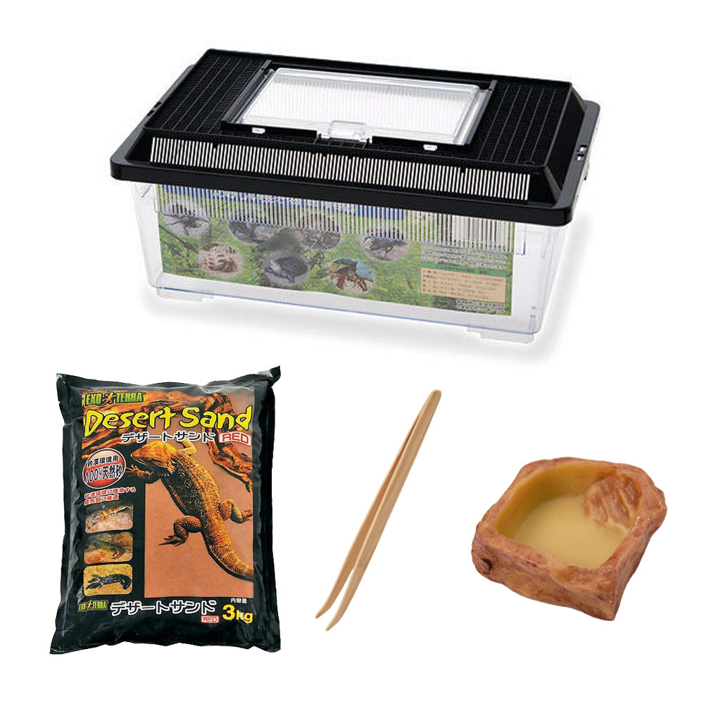| 特長 | ドライ環境で、昆虫飼育がすぐ始められるセットです。 【飼育容器 フラット 黒(365×215×155mm)】 ●高さが低いフラットタイプの大きなプラケースです。 ●小動物、金魚などの魚類、昆虫、両生類、爬虫類、ザリガニ等の飼育、稚魚・病魚の隔離等、様々な用途に使えます。 ●フラット仕様となっており、小動物にとって大切な通気がスムーズなのでいろいろなペットの飼育・観察に適しています。 【GEX エキゾテラ デザートサンド レッド 3kg】 ●砂漠環境を再現できる爬虫類専用床材です。 ●パウダータイプで、保温時の熱伝導にも優れています。 ●100%天然の砂を使用しています。 ●生体が穴を掘る習性を促し、ストレスを軽減します。 【GEX エキゾテラ ウォーターディッシュ S】 ●自然の岩をイメージしたテラリウムにぴったりな爬虫類・両生類用の水飲み皿です。 ●大きな爬虫類でもひっくり返しにくい安定した作りになっています。 ●小さな爬虫類・両生類・コオロギなどが溺れるのを防ぐためのステップ付です。 【バンブーピンセット】 ●生体を傷つけない、竹製のピンセットです。 ●使いやすいロングタイプです。 ●ピンセットの先が太いため、生体が誤って噛んでも歯や顎を傷めにくいです。 ●先曲タイプの為、コオロギなどの活餌もつかみやすいです。 |