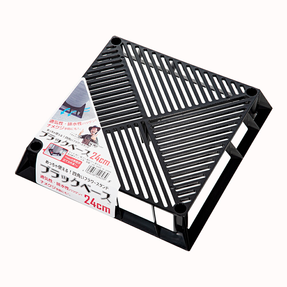 | 特長 | ●通気性、排水性を良くし、地熱が直接伝わらない事で栽培環境が良くなり、根腐れを防ぐことがでます。 ●5cmの高さがある事で風通しが良く、ナメクジなどの侵入を抑え、害虫の被害も軽減することができます。 ●直径11mmの支柱用に穴を4角に設けて、つる性植物などの栽培用に支柱の設置をできます。(※第一ビニール製の支柱の場合)鉢に支柱を差し込むと鉢ごと倒れやすくなってしまう問題を、ブラックベースに支柱を立てる事で 鉢の転倒を防ぎ、支柱自体も土に直接挿すよりも、安定して倒れなくなります。 ●壁面やコーナーに合わせてピタッと置けたり、二つ並べることで横長のプランターにも使用することができます。 |