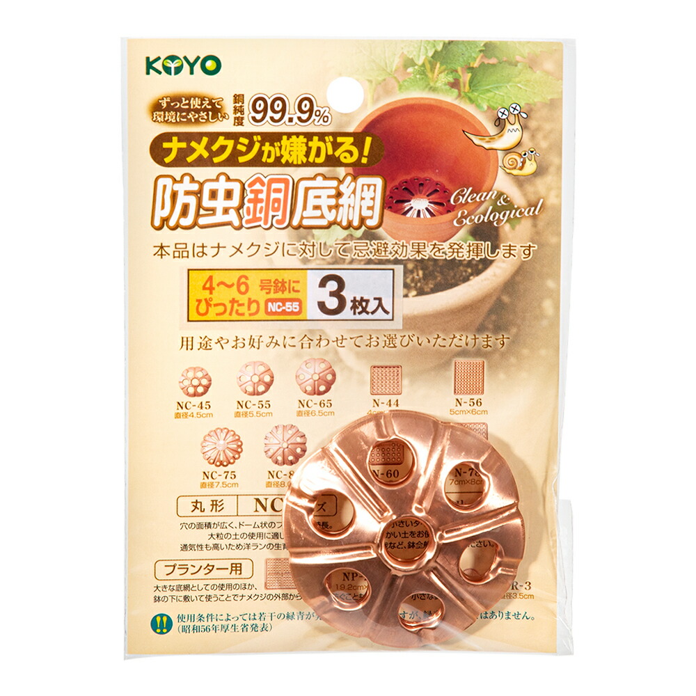 | 特長 | ●植木鉢やプランターの底に敷き、ナメクジ等の害を防ぐ防虫銅底網です。 ●銅イオンが溶出することによりナメクジ・かたつむり類が近寄りにくくなります。 ●家庭菜園にもご使用いただけます。 |
