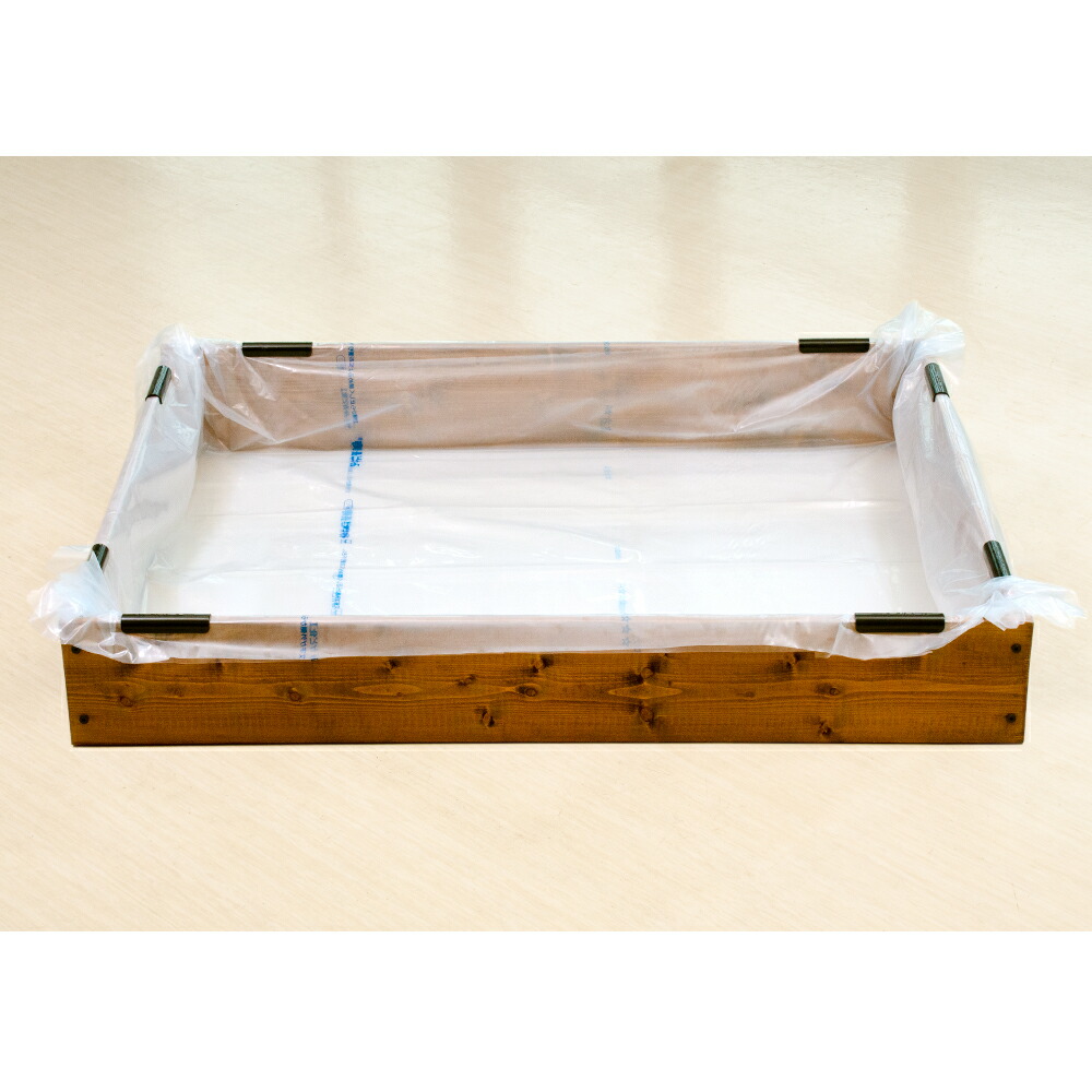 3.ビニール(2枚)を木枠の上にかぶせ、木枠の内面と底面全体にピッタリ覆うように調整し、木枠の上をパッカー(1辺につき2個)を押し込み、ビニールを留めてください。