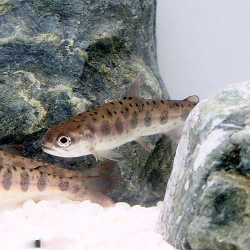 | 種類詳細 | 日本の渓流域に広く生息するサケの仲間です。ヤマメはサクラマスの河川残留個体で、体側に並んだパーマークと体側中央部に広がるピンクの色彩が美しいことから渓流の女王とも呼ばれます。アマゴに似ますが、体側に朱班がないことで区別可能です。古くから釣りの対象としてだけでなく水産資源としての利用され、渓流魚を代表する種といえるでしょう。飼育は難しく、エサは生餌を好み、エビや小魚も食ベます。縄張り意識が強いため混泳には隠れ家を用意する等注意が必要です。本種は冷水魚なので夏等にはクーラー等を使用して水温を18℃以下に保つ必要があります。 |