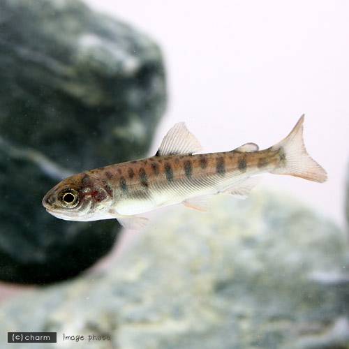 種類詳細 日本の渓流域に広く生息するサケの仲間です。ヤマメはサクラマスの河川残留個体で、体側に並んだパーマークと体側中央部に広がるピンクの色彩が美しいことから渓流の女王とも呼ばれます。アマゴに似ますが、体側に朱班がないことで区別可能です。古くから釣りの対象としてだけでなく水産資源としての利用され、渓流魚を代表する種といえるでしょう。飼育は難しく、エサは生餌を好み、エビや小魚も食ベます。縄張り意識が強いため混泳には隠れ家を用意する等注意が必要です。本種は冷水魚なので夏等にはクーラー等を使用して水温を18℃以下に保つ必要があります。