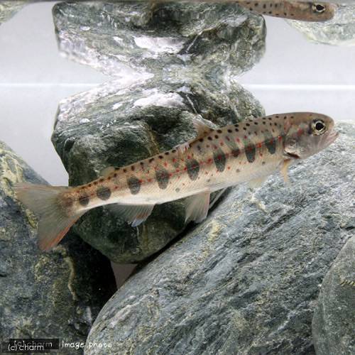 | 種類詳細 | 日本の渓流域に生息するサケの仲間です。アマゴはサツキマスの河川残留個体で、ヤマメによく似た色彩パターンを持ちます。体側に並んだパーマーク上に朱班がある点で判別されます。ヤマメと同様に古くから釣りの対象としてだけでなく水産資源としての利用され、渓流魚を代表する種といえるでしょう。飼育は難しく、エサは生餌を好み、エビや小魚も食ベます。縄張り意識が強いため混泳には隠れ家を用意する等注意が必要です。本種は冷水魚なので夏等にはクーラー等を使用して水温を18℃以下に保つ必要があります。 |