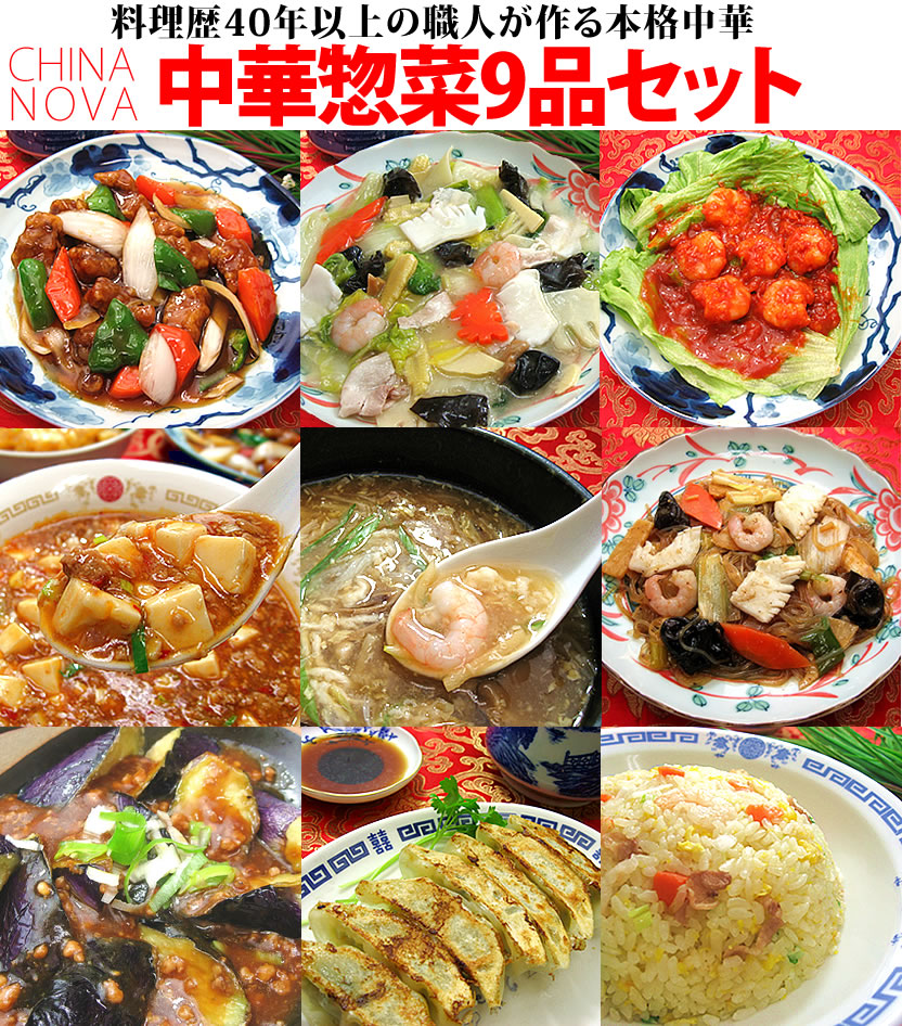 酢豚200g、八宝菜200g、エビチリ120g、麻婆豆腐250g、ナスの味噌炒め200g、海鮮のXO醤炒め200g、フカヒレスープ250g、黄金チャーハン230g、将軍餃子12個の9品入っています。しかも送料無料(沖縄は1000円、北海道は600円・離島は地域によって別途必要)※餃子はフライパンで焼いて下さい。チャーハンは電子レンジで温めてお召し上がり下さい。