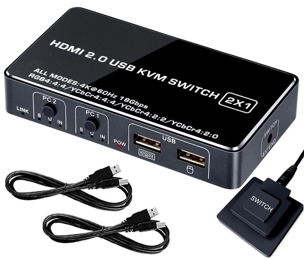 ELEVIEW KVMスイッチ HDMI 4K@60Hz パソコン2台 モニター1台 切り替え キーボード&マウス共有 省スペース化 アルミ合金筐体 高安定 手元スイッチ&USBケーブル付き