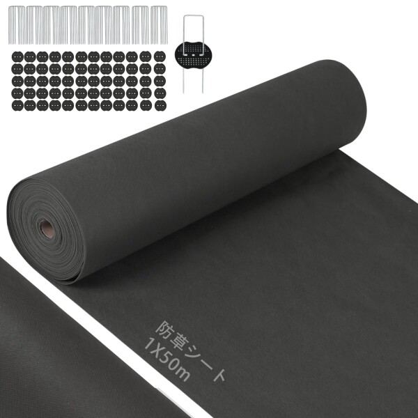 防草シート 除草シート 1m×50m ぼうそうシート 高透水 高耐久 高密度 Uピン杭50本と黒丸50枚付き 厚手 耐用年数は5年 雑草防止 工事用 園芸用 人工芝下シート UV耐候剤配合 農業 庭 通路など雑草防止シート