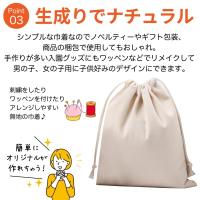 【生成りでナチュラル】 シンプルな巾着なのでノベルティーやギフト包装、商品の梱包で使用してもおしゃれ。 手作りが多い入園グッズにもワッペンなどでリメイクして男の子、女の子用に子供好みのデザインにできます。