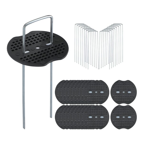 防草シート、人工芝、農業用ネット、不織布、ビニールマルチ、各種シート・マット、テント等を地面に設置・固定できる。