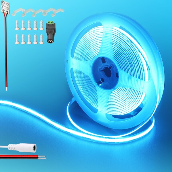 クリアヒル(Clearhill) 12V COB LEDストリップライト, 5M アイスブルーライト 480LEDs/m, 5521DCメスコネクターと赤黒リード線付属, 幅8mm 非防水IP20 180°発光CRI>=90 両面テープ変形可能 切断可能 DIY 家庭のインテリア用