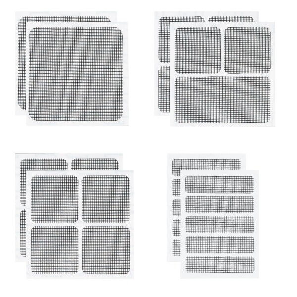 【8枚 十分な量】田字型の網戸補修シート2枚、品字型の網戸補修シート2枚、口字型の網戸補修シート2枚、網戸排水穴補修シート2枚。1年間で家のすべての網戸を修理・交換するのに十分な量です。多様なサイズがある為、様々な破損部位に対応できます。